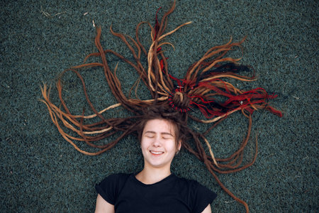 Top view of a happy teen girl with dreadlocks lies on the grass on the playground. Daytime, stadium, open air.