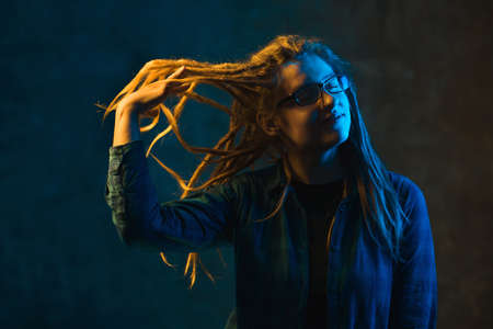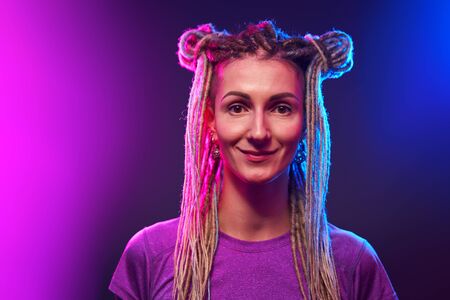 Girl with dreadlocks in colorful neon lighting on dark background. Stylish young woman in futuristic environment.