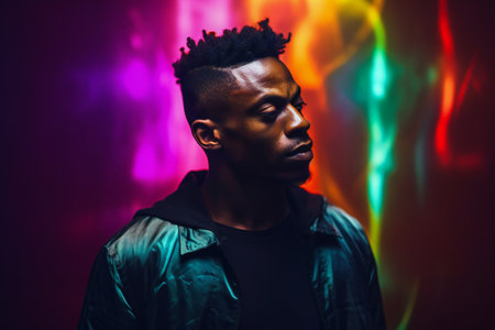 Beautiful model with colorful and trendy outfit with glowing purple green neon light, colorful dyed hair and fashionable african glitch core teenager girl. Picturesque generative AI