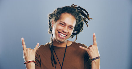Space, dreadlocks or portrait of man with rock hand gesture in studio for expression on grey background. Jamaica, edgy rocker and crazy person with devil horn sign, funky emoji and cool punk symbol