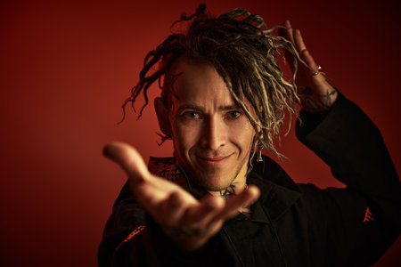 A male shaman in ethnic clothing with dreadlocks smiles and stretches his hand forward, inviting you into his mysterious world. Dark red background. Halloween, Fantasy.