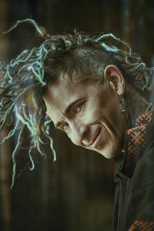 Close-up portrait of a brutal mature man with dreadlocks on his head and a black ethnic cloak, who is looking at the camera and smiling. Rock and punk culture.