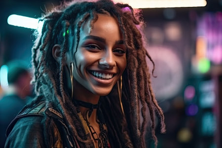 A portrait of a cute girl with dreadlocks in a cyberpunk style depicts a futuristic image with a touch of rebellion and individuality. AI generative.