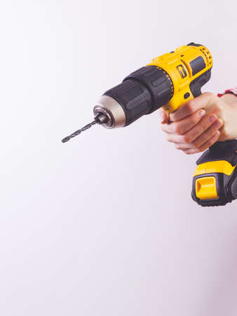 Unrecognizable woman holding yellow driller about to drill something. Hardware construction site objects concept.
