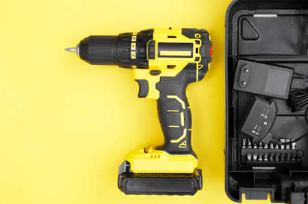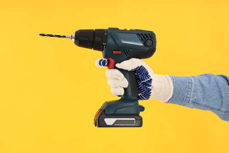female hand holds a cordless drill on a yellow background. Tool for work
