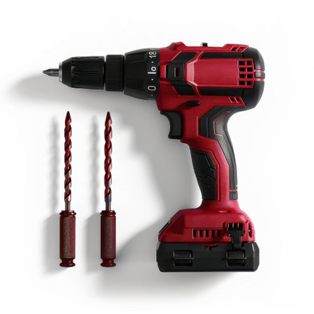 A detailed image of a power drill leaning against a cracked and weathered wall, highlighted with red markings and scattered metal screws, embodying a repair project's essence.