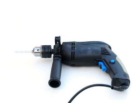 Electric drill on a white background. Close-up. Selective focus.
