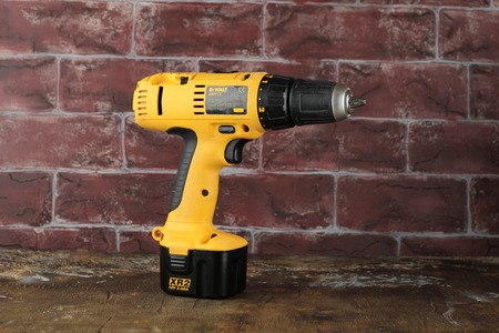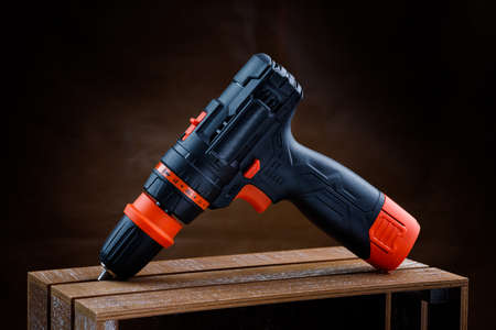 Cordless drill, screwdriver on a wooden background.