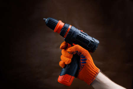 Orange screwdriver on a black background in the hand. Screwdriver and electric drill with power supply. Professional repair service. home design.