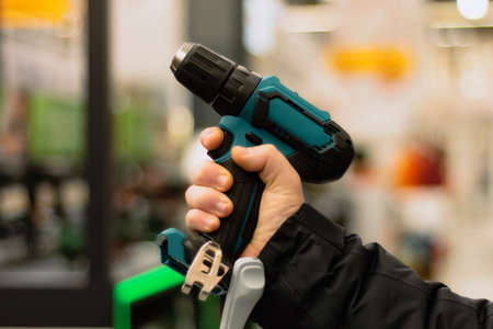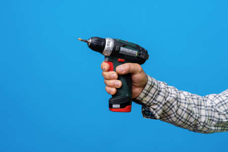 Cordless screwdriver in hand. Cordless tool in a mans hand. The concept of repair and construction on a blue background.