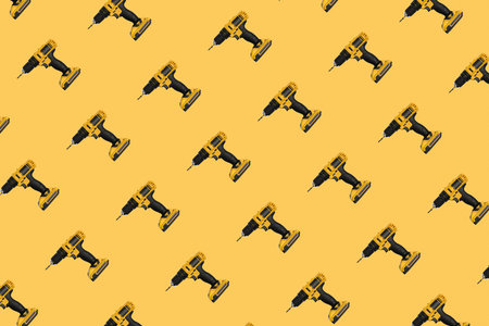 Green electric drill on yellow background with copyspace, top view, flat. Construction Tools
