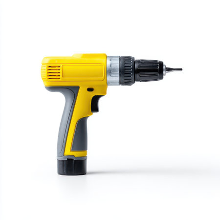 Close-up of a yellow electric drill against a blurred workshop background, showcasing tool detail and workshop vibe.
