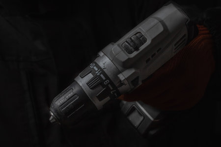 powerful drill with a drill inserted close up on a dark background.