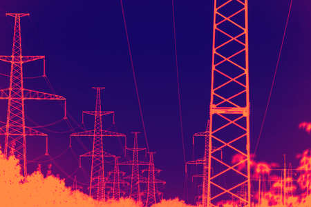 High voltage electric pole and transmission lines in the evening. Electricity pylons at sunset. Power and energy. Energy conservation. High voltage grid tower with wire cable at distribution station.