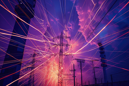 A breathtaking view capturing dramatic lightning strikes surging from power lines under a dark, stormy sky. The urban landscape serves as a backdrop.
