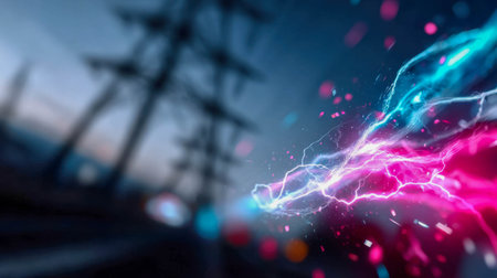 Abstract glowing lightning energy with neon sparks against blurred background of electricity poles.