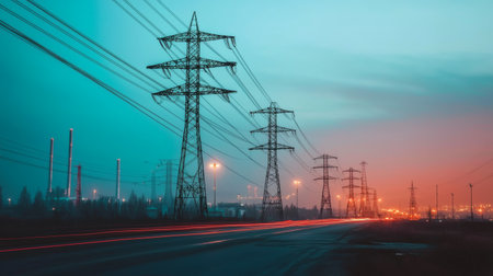 Amidst a dusky skyline, towering electrical pylons rise, silhouetted against vibrant hues of blue and orange. Bright city lights twinkle in the background as vehicles glide by.