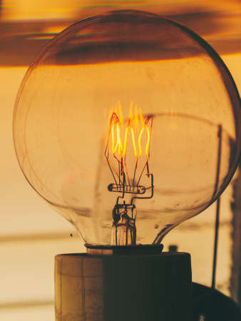 Vintage light bulb decor glowing in dark room. Lighting decor.