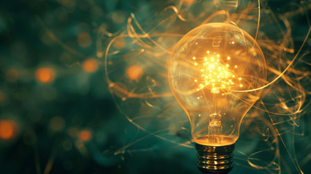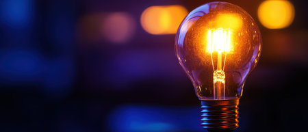 Close-up of a light bulb with a filament glowing brightly, symbolizing creativity, innovation, and inspiration.