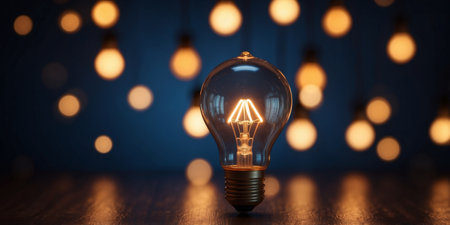 A warm glowing light bulb stands prominently against a dark backdrop casting a soft inviting light in the surrounding area.
