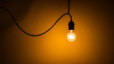 A single incandescent light bulb hangs from a black electrical cord against a textured, warm orange wall. The bulb emits a bright, warm yellow glow, casting soft shadows and illuminating the immediate area. The minimalist composition focuses on the simple form of the light bulb and its connection to the cord. The scene evokes a sense of warmth, simplicity, and perhaps the genesis of an idea, with its solitary light source against a dark, textured background.