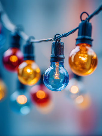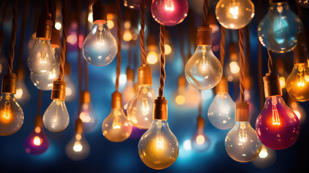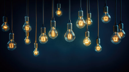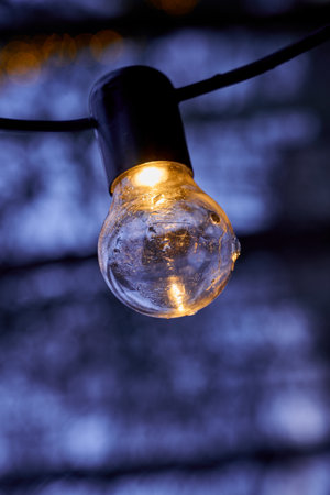 Glowing bulbs hanging against a bokeh blue background, illuminating the dark