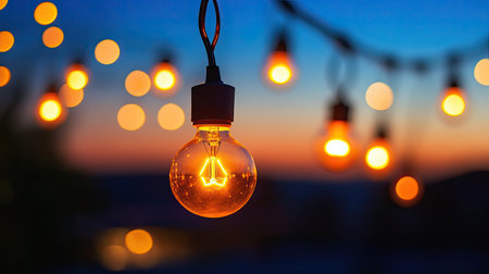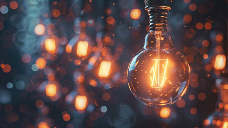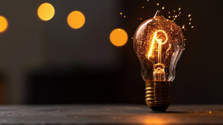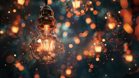 Glowing light bulb with sparkling filament emits warm, inviting glow, surrounded by soft bokeh lights in background, creating cozy and inspiring atmosphere