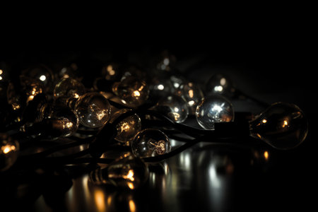 Brightly lit light bulbs connected together, illuminating a dark space and representing the power of creative thinking in business.