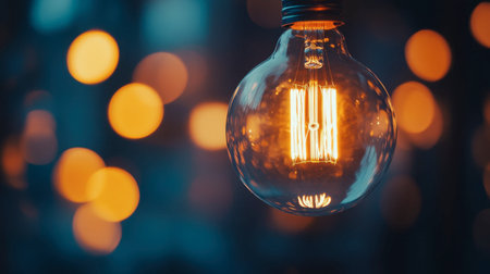 A glowing filament inside a vintage Edison-style light bulb with a blurred background of warm bokeh lights, creating a cozy ambiance.