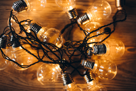 Background - electric garland with incandescent bulbs, yellow warm light, retro style