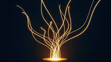 Dynamic Stream of Golden Light Streaks Creating an Abstract Pattern in a High-Energy Modern Setting