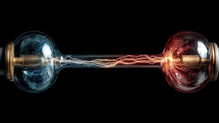 Captivating image of electric discharge showcasing vibrant blue and red plasma arcs between two glass spheres, set against a dark background.