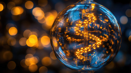 A close-up of a light bulb with intricate filament design, glowing in the dark, creating a vintage feel