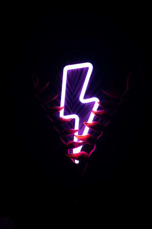 A vibrant lightning bolt bursts through the dark background, glowing with neon colors like blue, pink, and yellow. The illustration captures the intense energy and dynamic movement of electricity.
