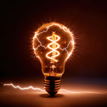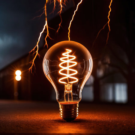 A glowing light bulb with electric sparks around it representing creativity and the power of ideas in a dark setting.