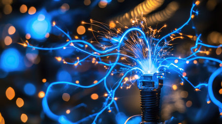 A stunning close-up image capturing the dynamic electric sparks and blue lightning energy between high voltage connectors in a laboratory setting.