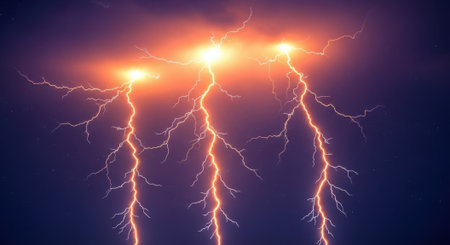 Three vibrant orange lightning bolts crackle and branch across a dark sky.