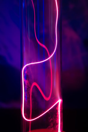 High-voltage plasma discharge inside a glass tube. Science experiment with electrical energy and ionization of gas.