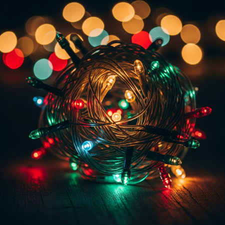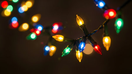 A vibrant string of multicolored Christmas lights against a dark background, creating a festive and cozy atmosphere. The lights are in sharp focus in the foreground, while the rest of the string is blurred, adding depth to the image.