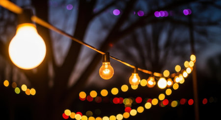 Glowing christmas lights bulbs design illumination, celebration, decoration concept.