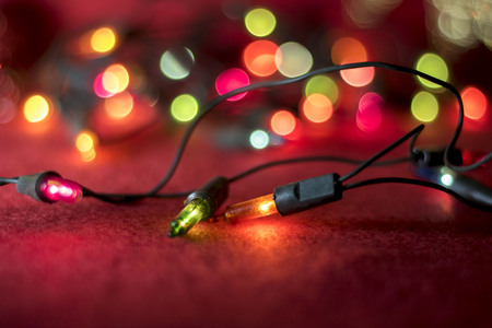 Lamp closeup and little white lights on a garland lying on the floor, blur