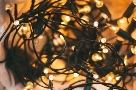 Background - electric garland with incandescent bulbs, yellow warm light, retro style, star filter, atmospheric close-up