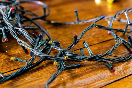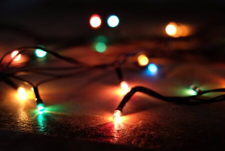 Christmas garland lights on a wooden floor. New Year and Christmas background