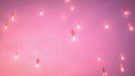 Pink background with hanging light bulbs emitting a soft glow, creating a dreamy and romantic atmosphere.