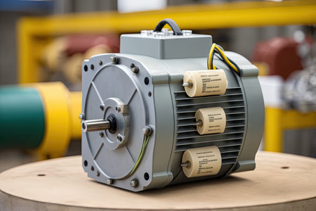 cylindrical three-phase electric motor and box with wires on blurred background, created with generative ai