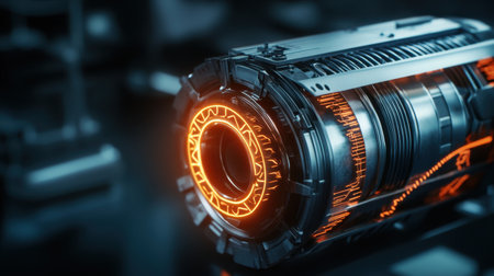 This striking image showcases a futuristic engine component with intricate details, highlighted by glowing circuits and a polished surface, emphasizing advanced technology.