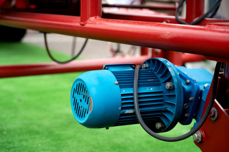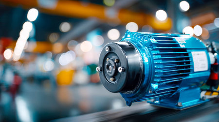 Close-up of a blue industrial electric motor in factory environment, symbolizing engineering, energy, and machinery.