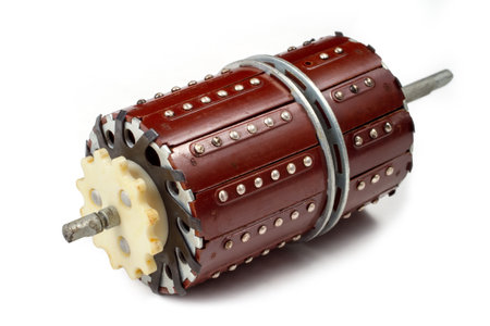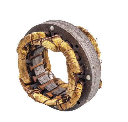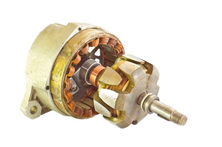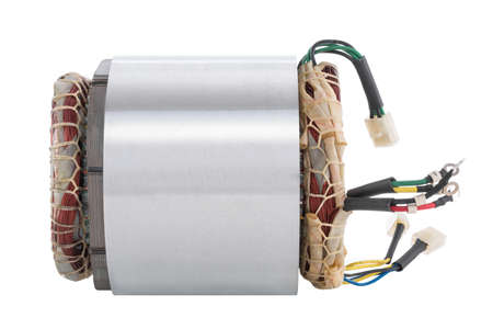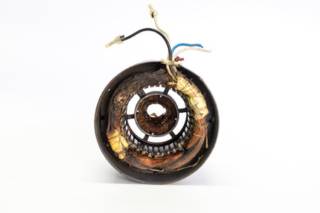 Old damaged rotor of electric motor on white background. Copper coils inside electric motor