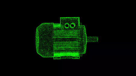 3D electric motor on black background. 3 phase induction motor. Business Advertising backdrop. For title, text, presentation. Object dissolved flickering particles. 3d animation