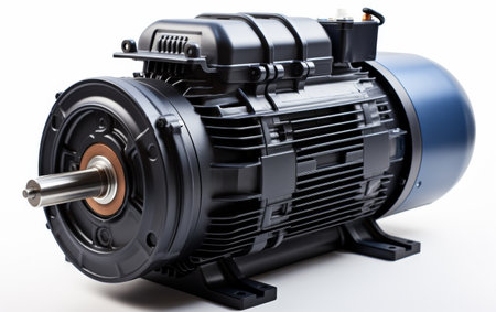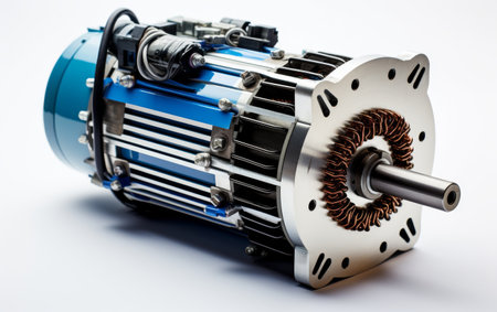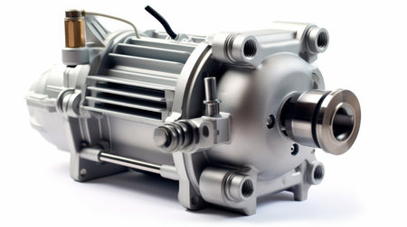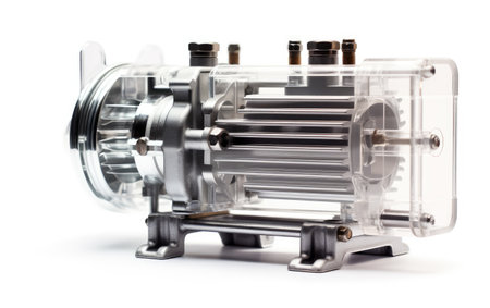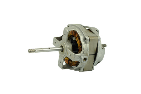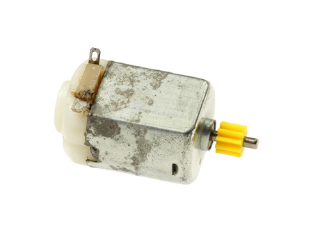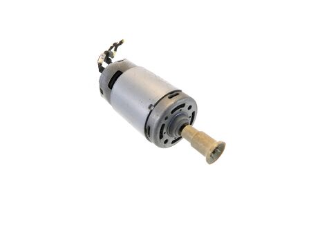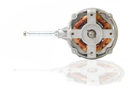 Small electric motor for household appliances. Electric drive powered by low voltage. White background.